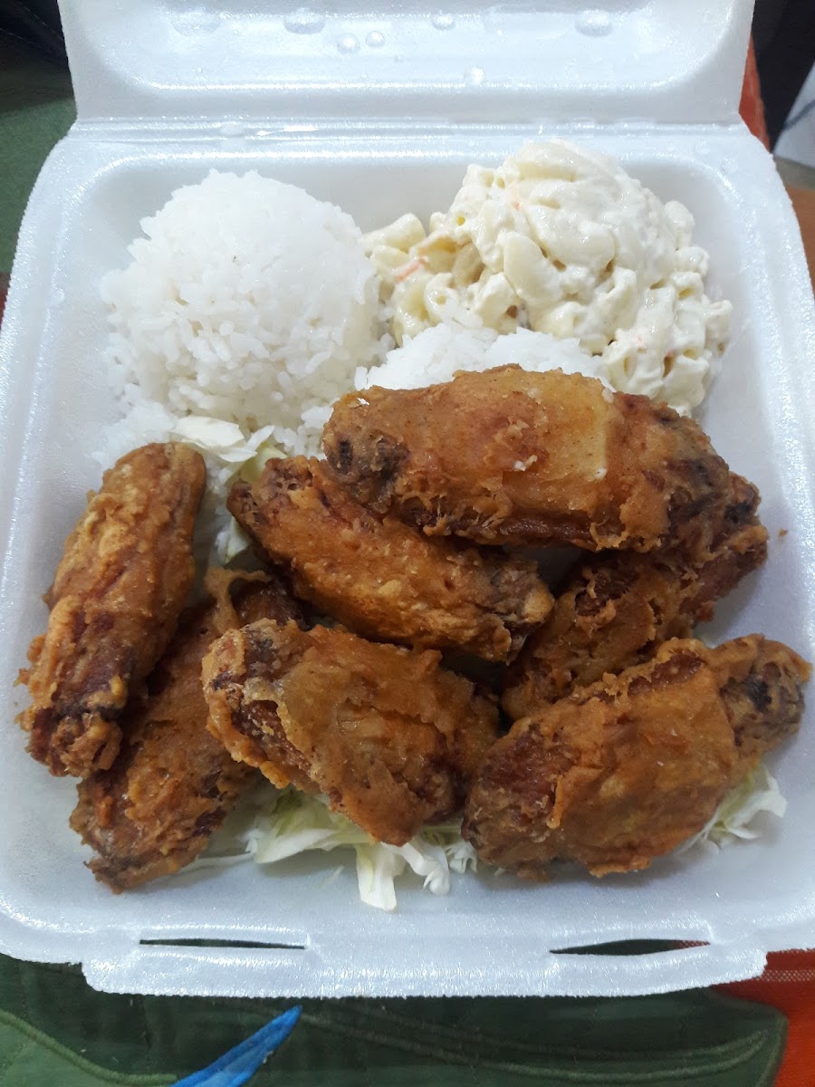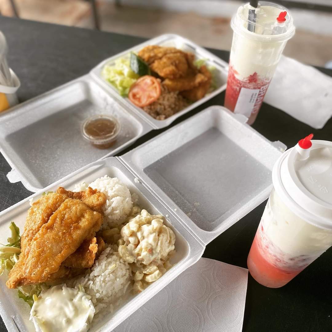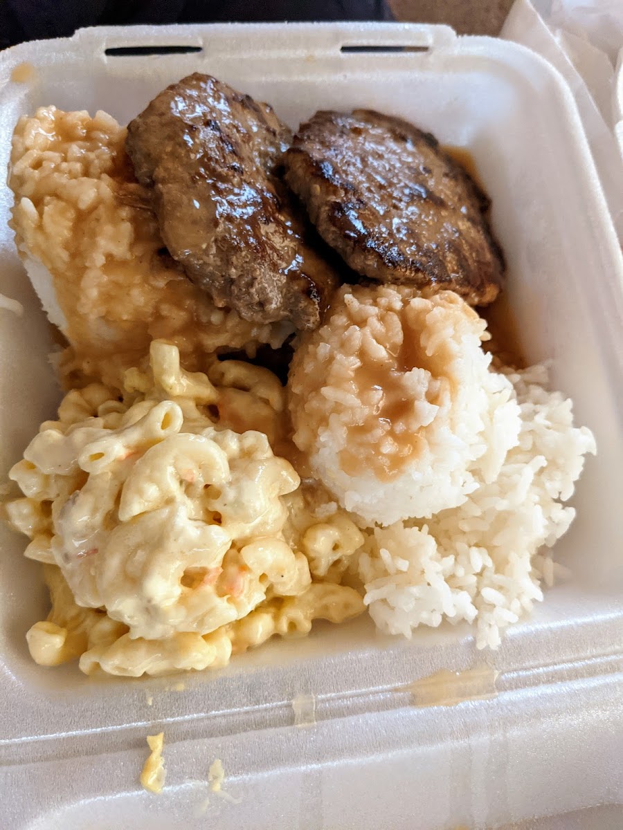As of July 2022 there are three 2 seat tables outside the store available if you want to eat there. Ordered a roast pork plate for $14. Serving size was pretty decent and enough for us to split. The roast pork had good flavor and it's pan fried to make nice crispy bits. Gravy is. Pretty good along with the mac salad that has bits of tuna in it. Only real downside is the rice as it was a little mushy. Overall I'll definitely be back again.